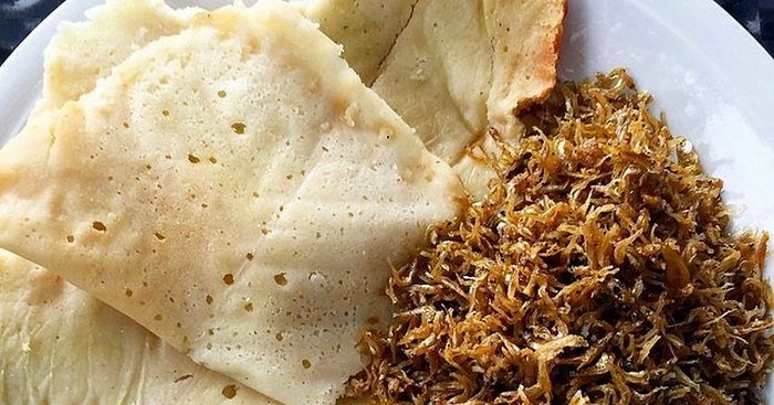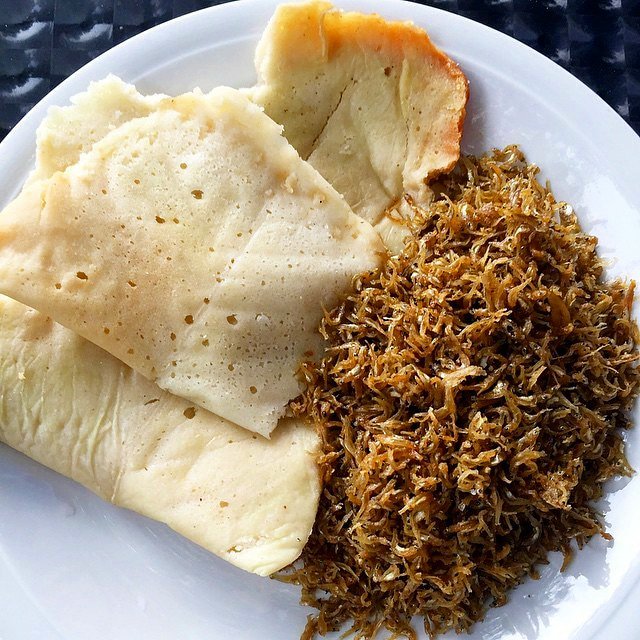 It is best enjoyed with a spicy tomato salsa (known as raw pepper), and fried tiny white baits known as ‘one man thousand’.