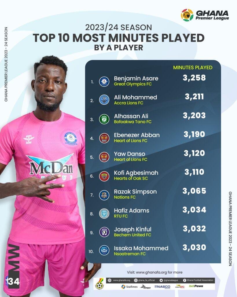 Great Olympics goalkeeper, Benjamin Asare, featured in the League more than any other player with 3,258 minutes. Nine of the top 10 players with the most League appearance are defenders with one goalkeeper in the list.