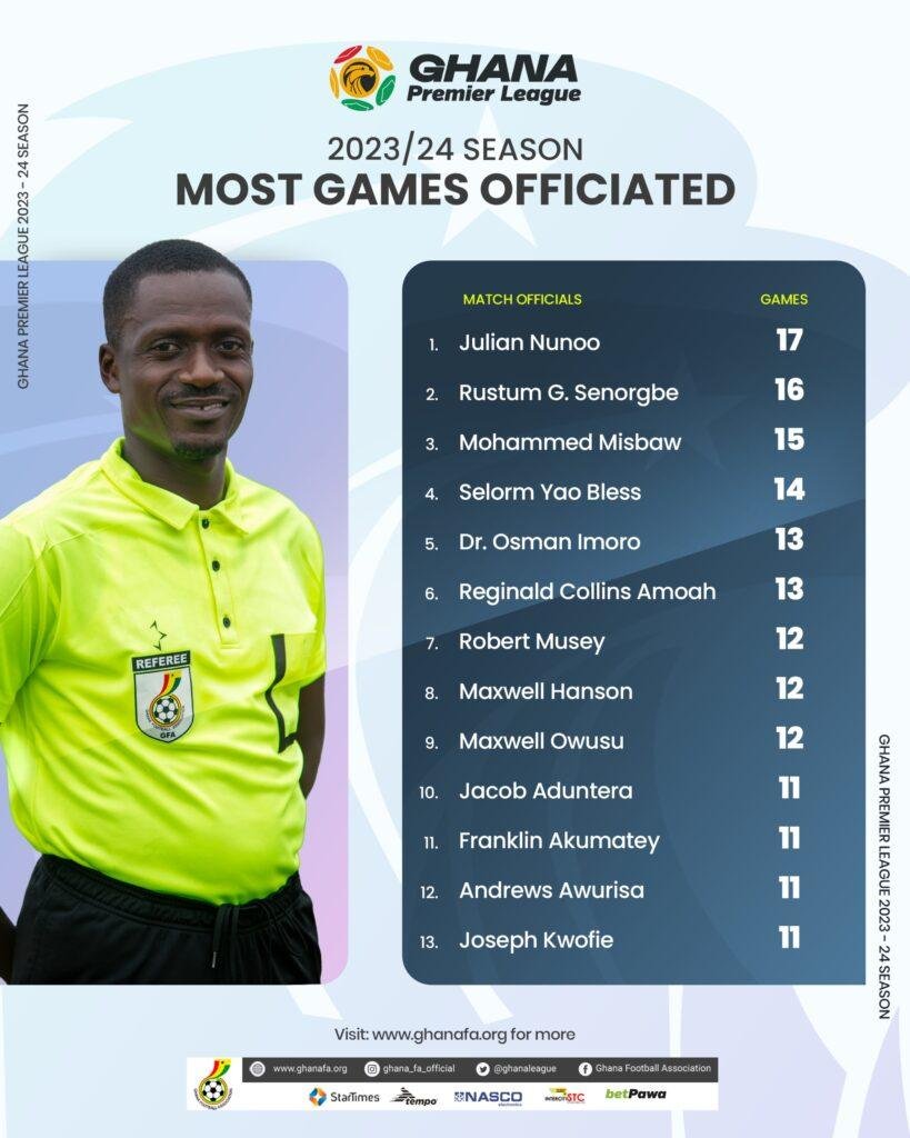 Thirty-One (31) centre referees officiated 306 Ghana Premier League games with Julian Nunoo officiating 17 of the games – the highest of the season. Juliet Appiah is the only female centre referee to officiate in this seasons League.