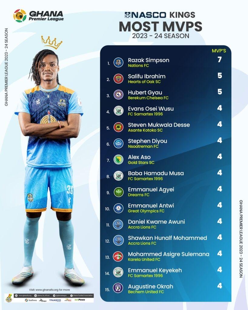 Nations FC defender, Razak Simpson, won the NASCO Man of the Match awards more than any other player. The former WAFA Centre back bagged seven Man of the Match awards in his debut campaign with Nations FC.