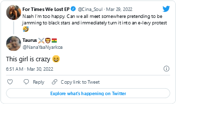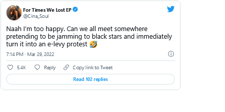 The first part of Cina Soul’s tweet read, “Naah I’m too happy”. But in a sharp contrast, she continued, “can we all meet somewhere pretending to be jamming to black stars and immediately turn it into an e-levy protest?”