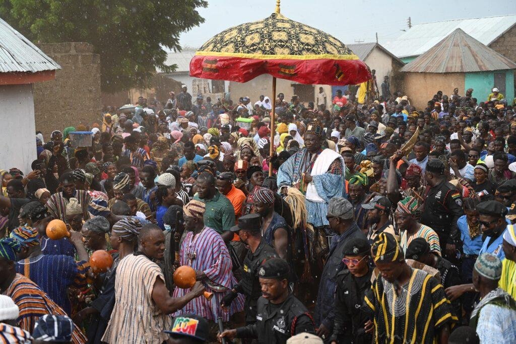 One of the most breathtaking spectacles of Damba is the procession of the queens. Adorned in regal cloths and glittering ornaments, they gracefully carry golden-coloured bowls, abolition cans, utensils, sandals, and animal skins, the very seat and symbols of authority for the chiefs.