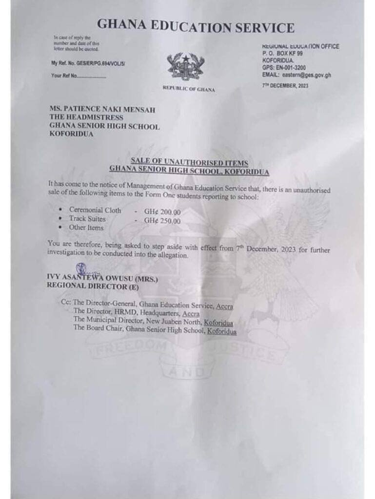 The Ghana Education Service (GES) has interdicted Patience Naki Mensah, the headmistress of the Ghana Senior High School in Koforidua, for allegedly selling unauthorized items to Form One students reporting to the school.