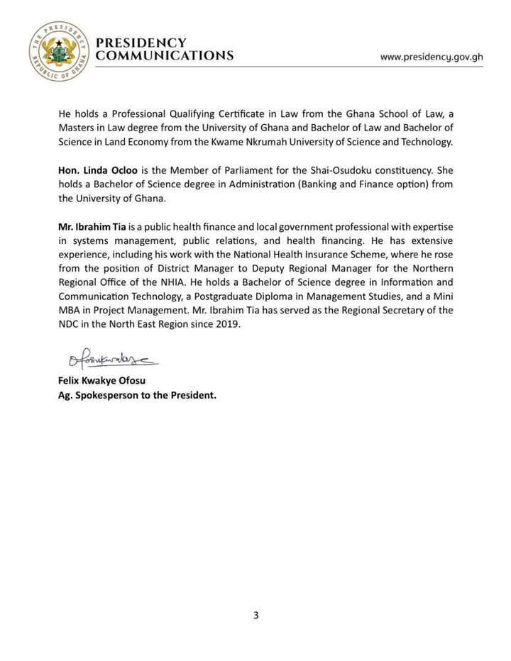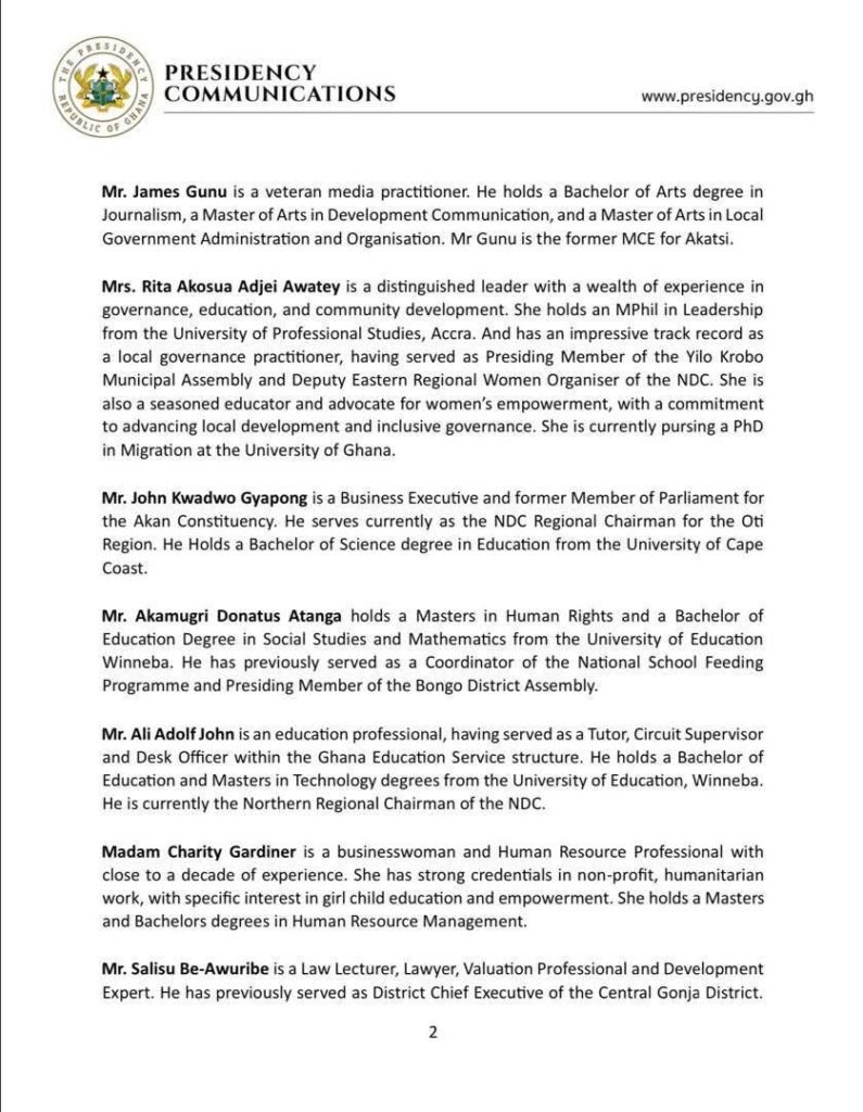 He submitted the names of the underlisted to Parliament, through the Speaker, for prior approval to serve as Regional Ministers.