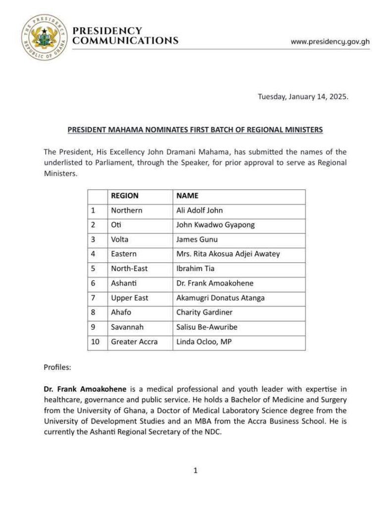 The President, John Dramani Mahama, has submitted names of first batch of regional ministers to Parliament.