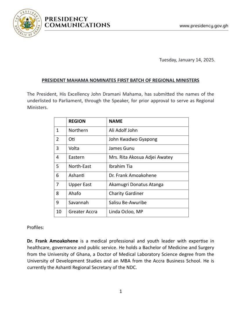 The 10 out of the 16 regional ministers submitted to Parliament are Ali Adolf John (Northern), John Kwadwo Gyapong (Oti), James Gunu (Volta), Mrs Rita Akosua Adjei Awatey (Eastern), Abraham Tia (North-East), Dr.Frank Amoakohene (Ashanti), Akamugri Donatus Atanga (Upper East), Charity Gardener (Ahafo), Salifu Be-Awurebi (Savannah), and Linda Ocloo (Greater Accra).