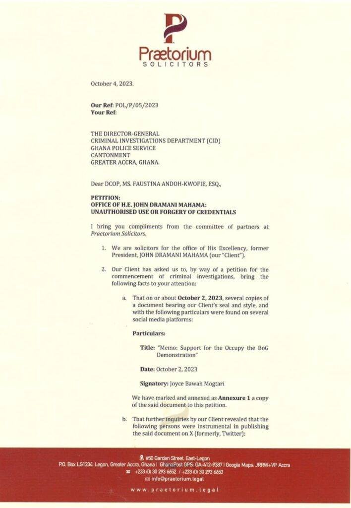 Lawyers of former President John Dramani Mahama have petitioned the Director-General of the Criminal Investigations Department (DCOP) of the Ghana Police Service (GPS) to investigate the unauthorized use of their client’s credentials.