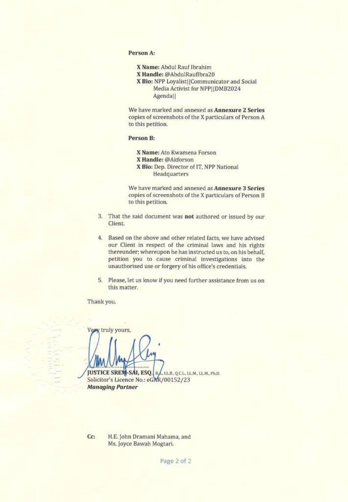 They further noted that additional inquiries revealed that the individuals behind the publication of the document were members of the New Patriotic Party (NPP), emphasizing that “The said document was not authored or issued by our client.”