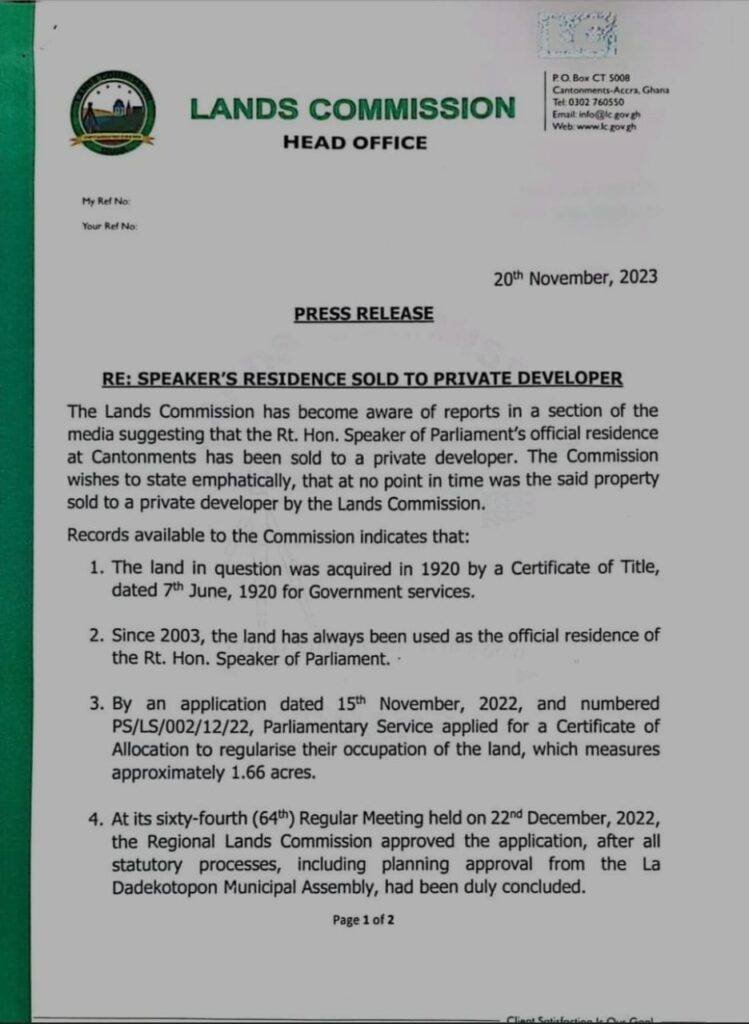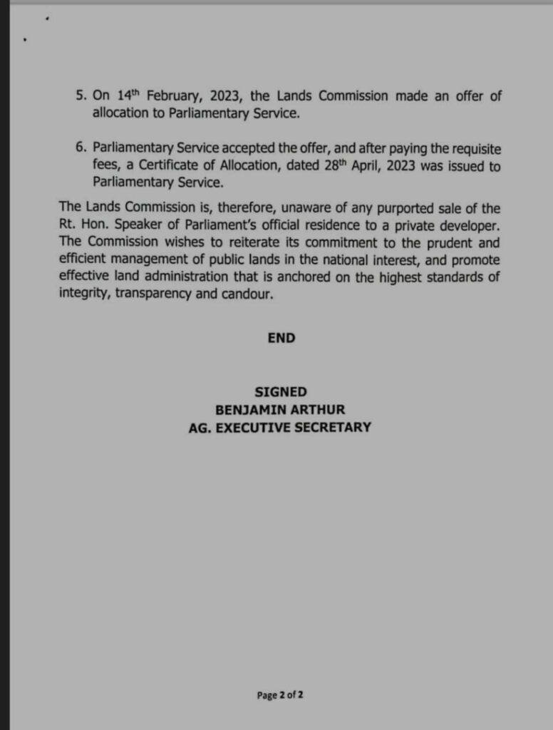 The Lands Commission, therefore, emphasized that it was unaware of any purported sale of the Speaker’s official residence to a private developer.