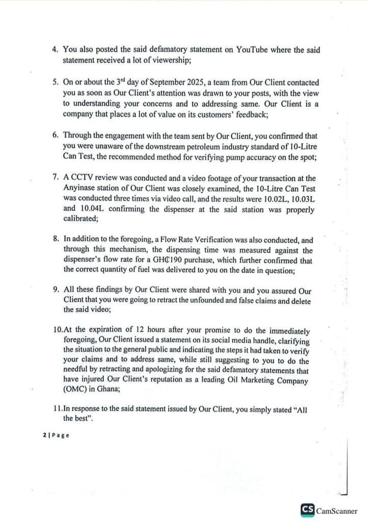 According to the lawyers, Mr. Mensah posted on Facebook on September 3, 2025, alleging that he had been cheated after buying fuel at Star Oil’s Anyinase station near Elubo.