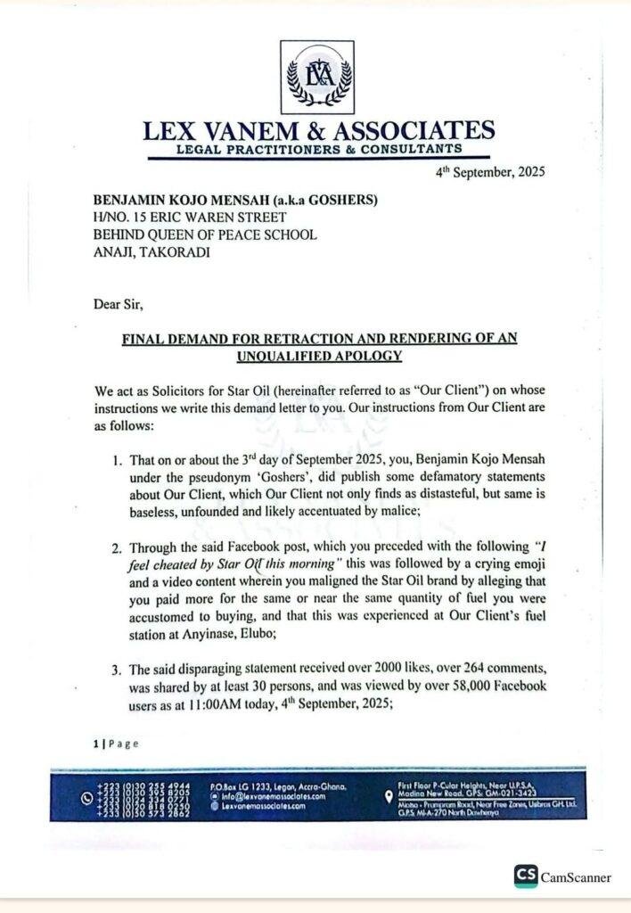 Lawyers of Star Oil have issued final demand notice to social media user Benjamin Kojo Mensah, popularly known as Goshers, demanding GHS 20 million in damages for defamation.