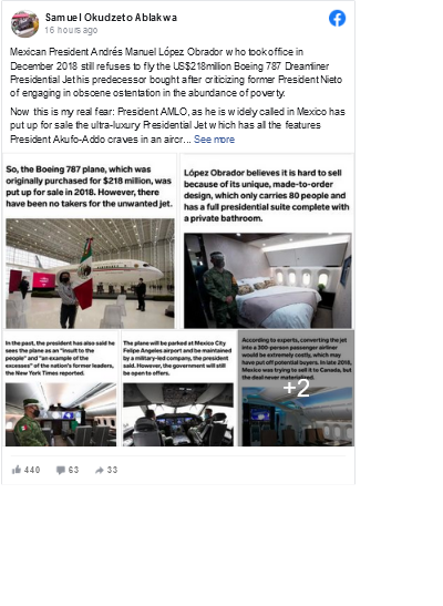 Rather than entertain thoughts of purchasing the Mexican presidential jet, Mr Ablakwa has urged President Akufo-Addo to emulate President Andrés Manuel López Obrador, who insists on flying commercial, consistent with his policies of austerity and modest leadership; therefore, his decision to sell the Boeing 787 Dreamliner Presidential Jet bought at $218 million by his predecessor.