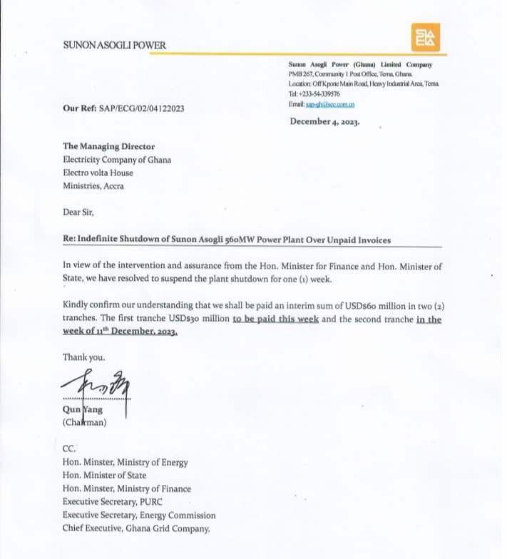The company, in a letter addressed to ECG and sighted by Citi News, reads: “Sunon Asogli Power (Ghana) Limited Company announces with regret an indefinite suspension of operations at the Sunon Asogli Power Plant, effective Monday, 4th December 2023 at 6 PM. This difficult decision became necessary due to avoidable delays in payment from the GoG/Electricity Company of Ghana for power supplied, as well as, the unproductive engagements to find an amicable solution” to the indebtedness.