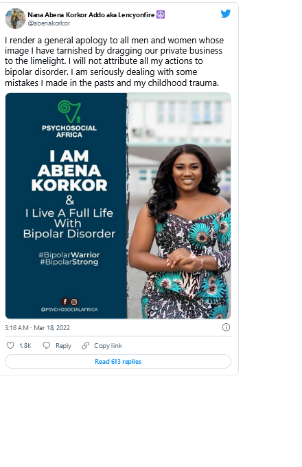 “I will not attribute all my actions to bipolar disorder. I am seriously dealing with some mistakes I made in the past and my childhood trauma,” she stated.