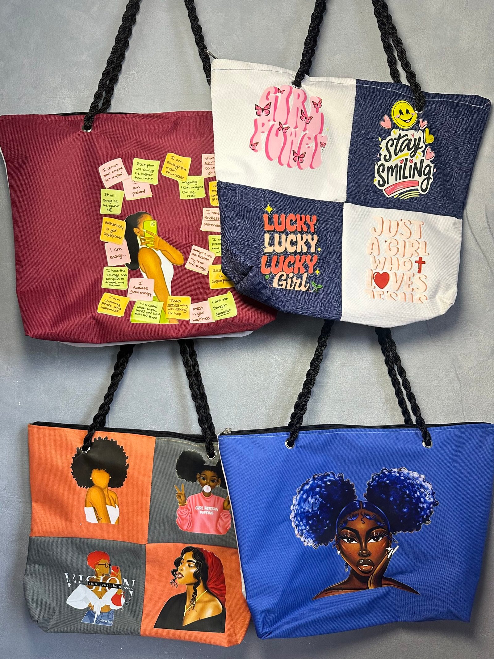 Using African prints, bold quotes, and clean designs, Caroline creates tote bags that tell a story.