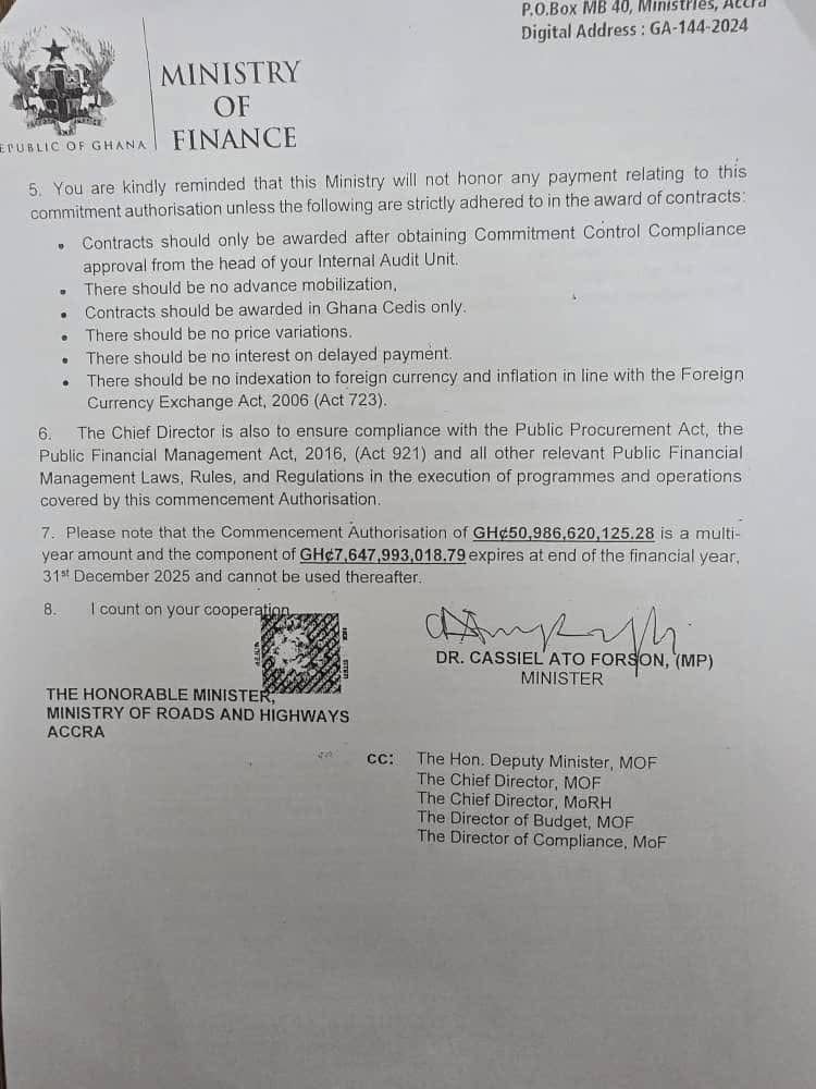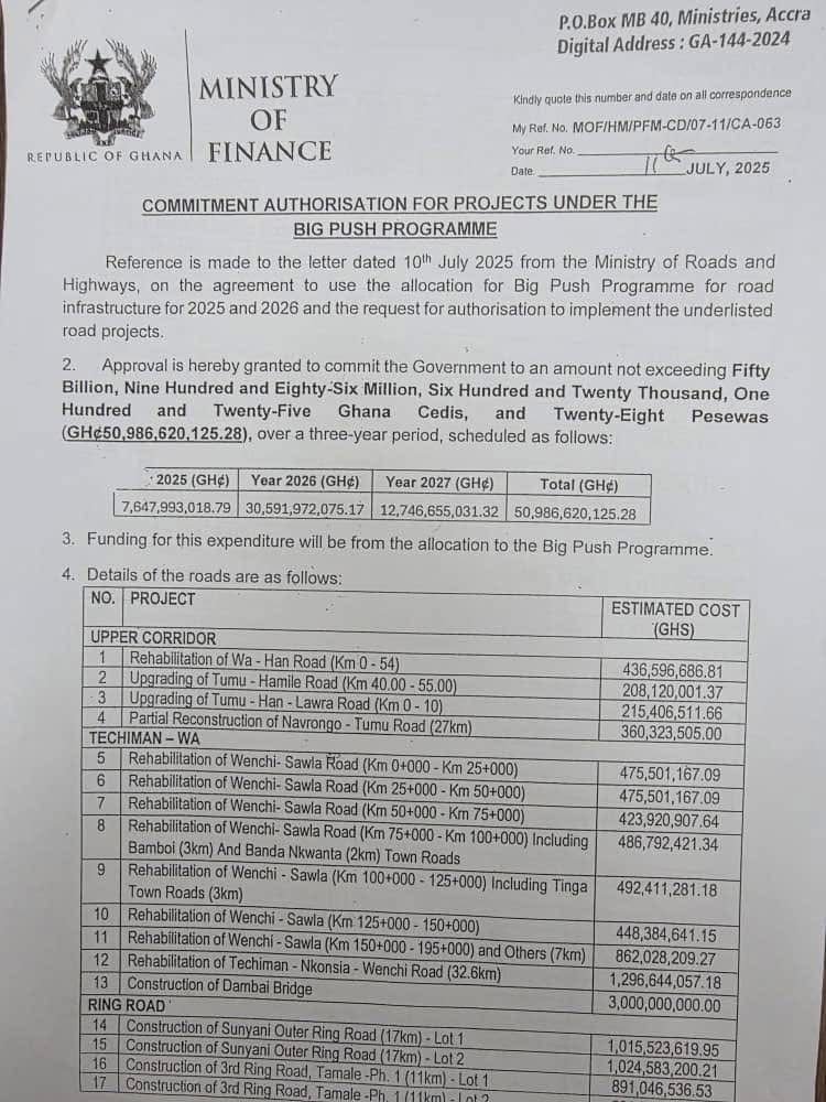 Mr Asafuah alleged that the Ministry of Finance has given approval to the Ministry of Roads and Highways to commit over GH¢50.9 billion for the “Big Push” programme over a three-year period from 2025 to 2027 without the necessary approval from Parliament.